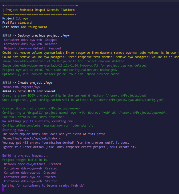 I have a custom built Drupal construction bash script called bedrock. It allows me to spin up a new Drupal site locally using ddev in seconds, but also has some important custom site setup features which I prefer like setting up the repo in github, adding a dotenv file for environmental variables, configuration options for local, staging and production and some custom modules/ themes installed and setup (I know I can use profiles for this but prefer to control it all via 1 simple build script).